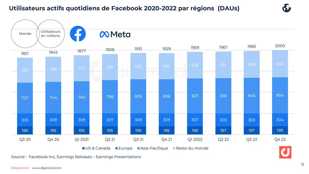 Facebook kündigt für Dezember 2022 2 Milliarden täglich aktive Nutzer an, das sind +4% im Vergleich zu Q4 2021.