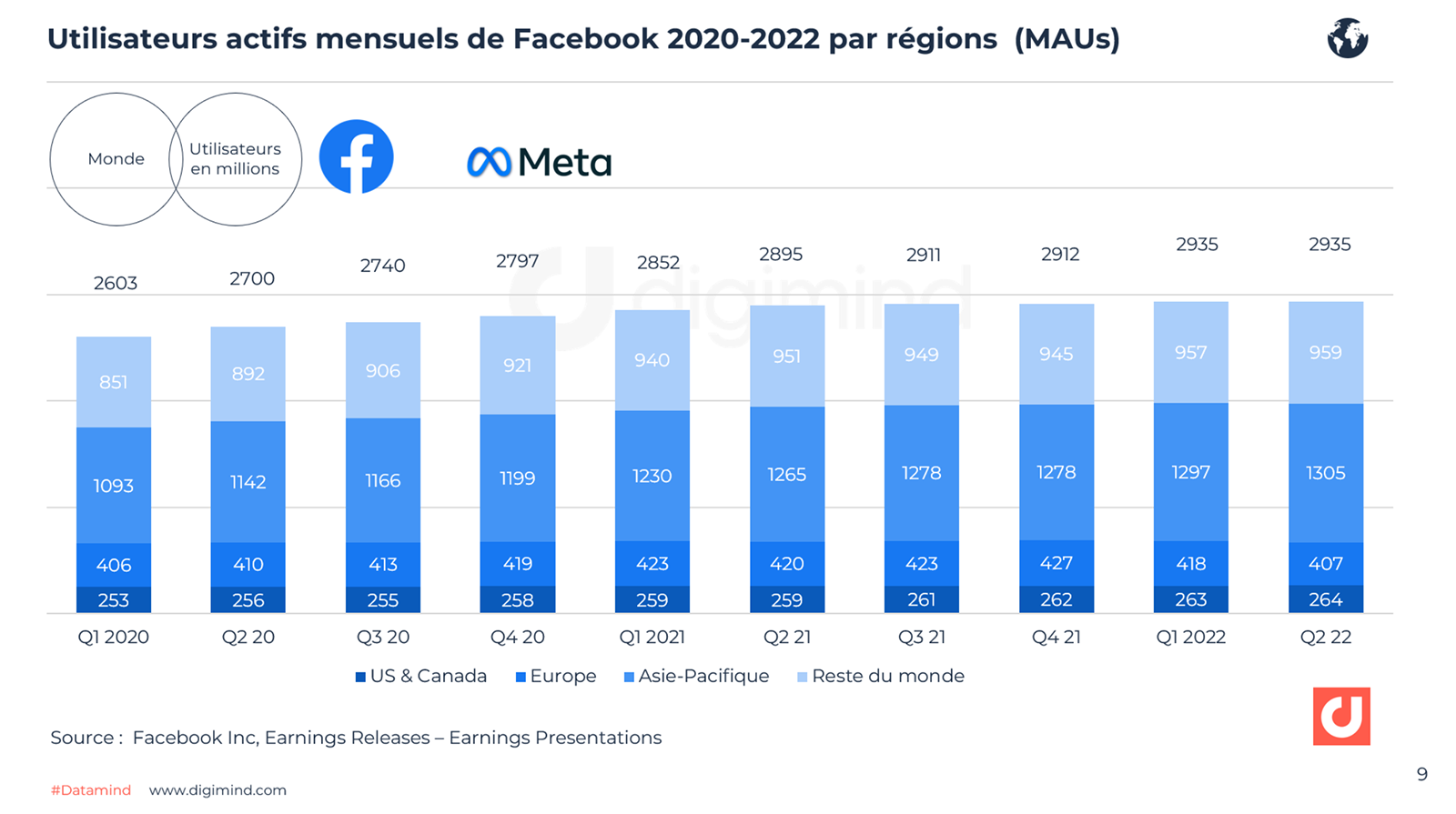 Facebook declares in July 2022 2.934 billion monthly active users (MAU) or +1% compared to Q2 2021.