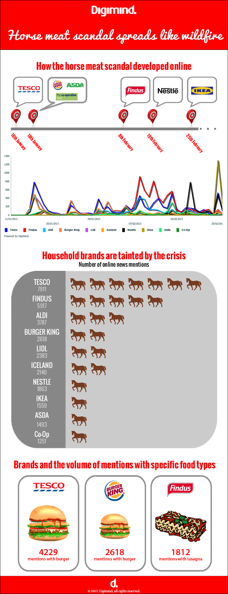 In an earlier blog post we looked at how the horse meat furore has been playing out online, by focusing on the number of online news articles for each brand implicated in the crisis.