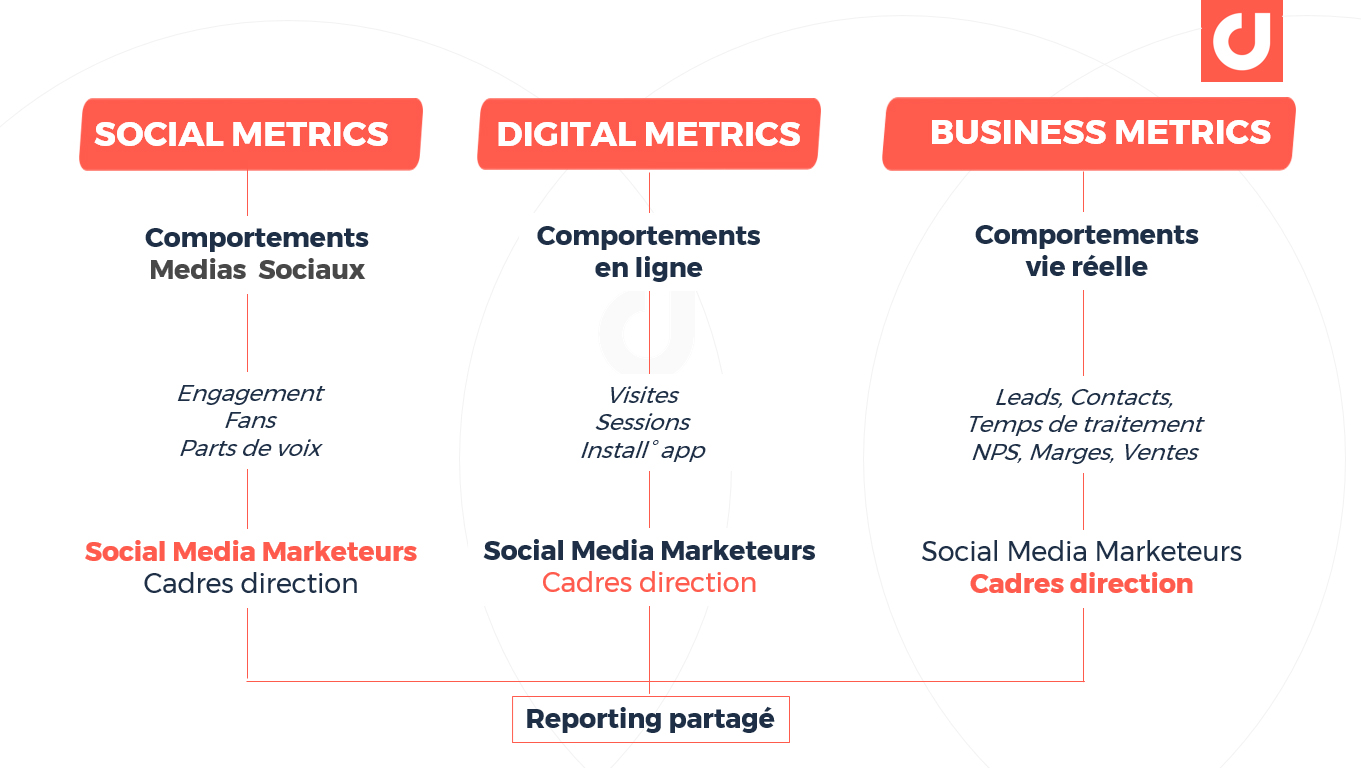 4. Además de monitorizar el marketing en medios sociales, los dashboards deben combinar 3 tipos de indicadores: Como hemos visto, hay que ser capaz de estudiar y poner en perspectiva los indicadores de medios sociales, digitales y empresariales.