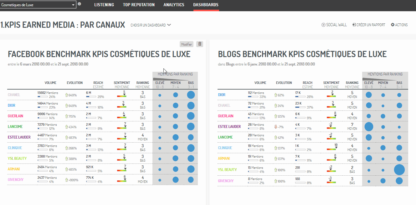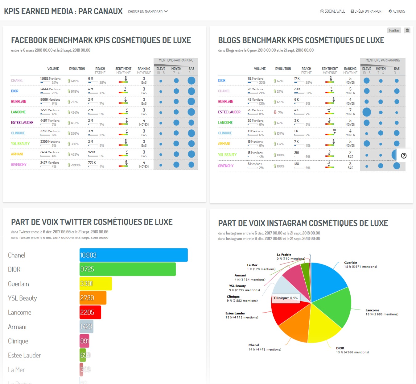 Los dashboards deben cubrir la medición del rendimiento de tus propios medios sociales y los de tus competidores, así como el análisis de conversaciones espontáneas, sobre tu última campaña, por ejemplo.