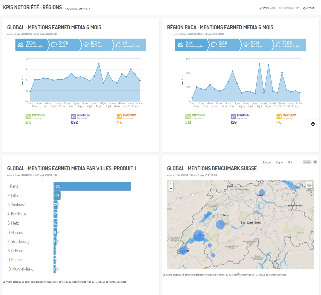 - Visualizar los KPI de las redes sociales por canal para zonas geográficas cada vez más pequeñas: Europa > Francia > Regiones > Ciudades