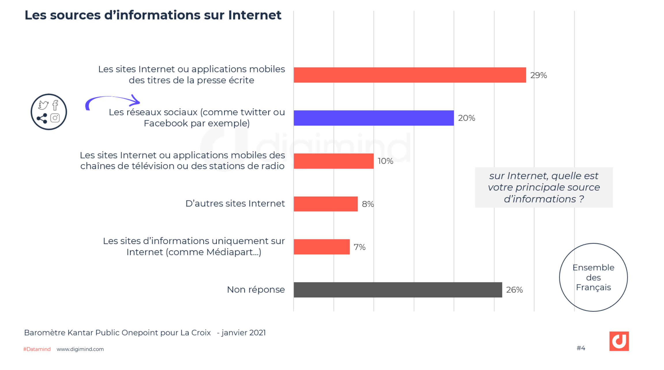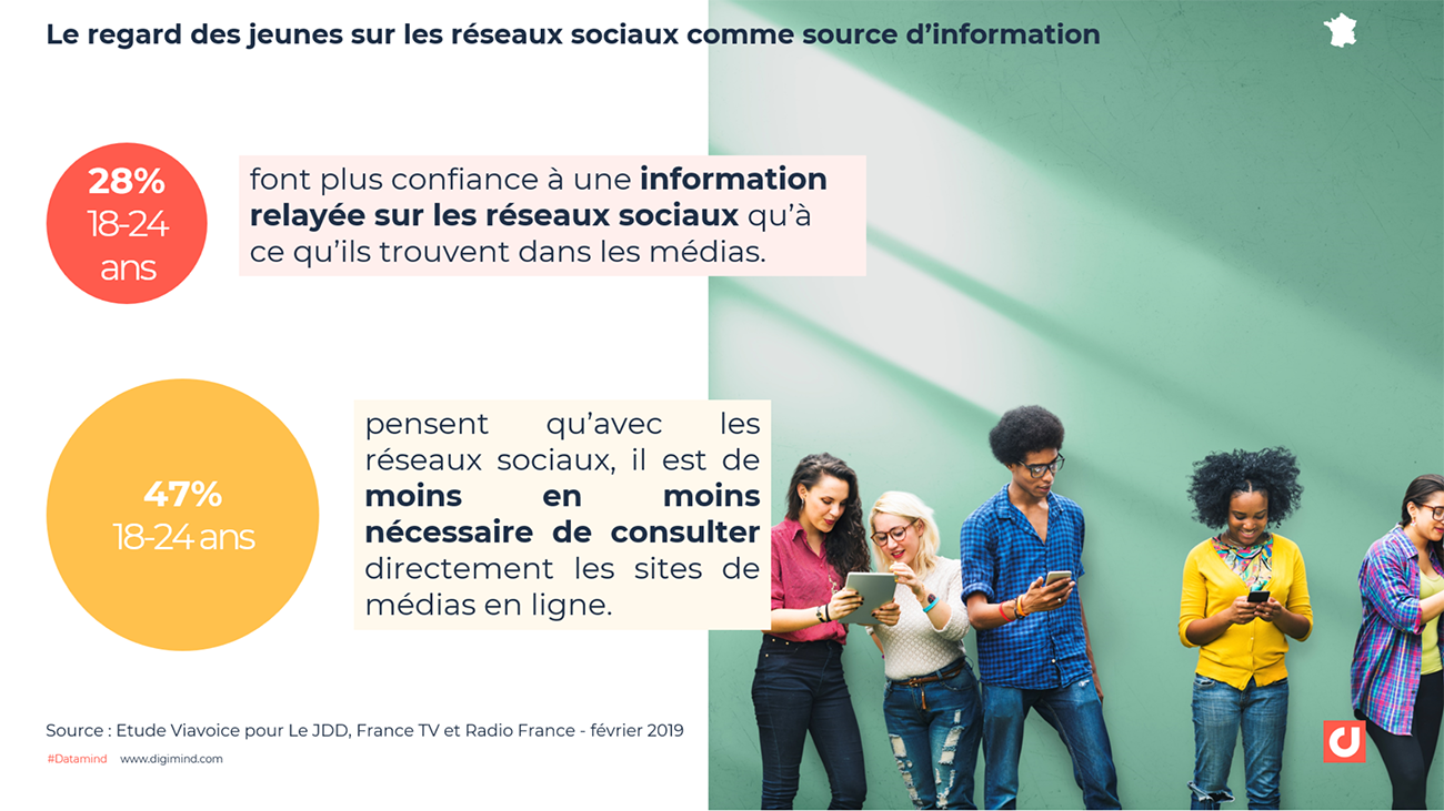 Ainsi, l’étude Viavoice (7) soulevait dès 2019 que 28% des 18-24 ans font davantage confiance à une information relayée sur les réseaux sociaux qu'à ce qu'ils trouvent dans les médias, tandis que 47 % de ces 18-24 ans pensent également que "avec les réseaux sociaux, il est de moins en moins nécessaire de consulter directement les sites de médias en ligne".