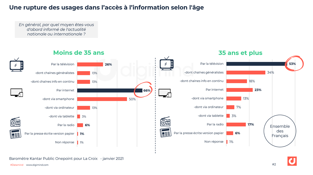 - Chez les moins de 35 ans, la tendance est inversée : ils s'informent d'abord par internet (66%), principalement avec le smartphone, puis par la télévision (seulement 26%). La presse écrite est très minoritaire (1%).