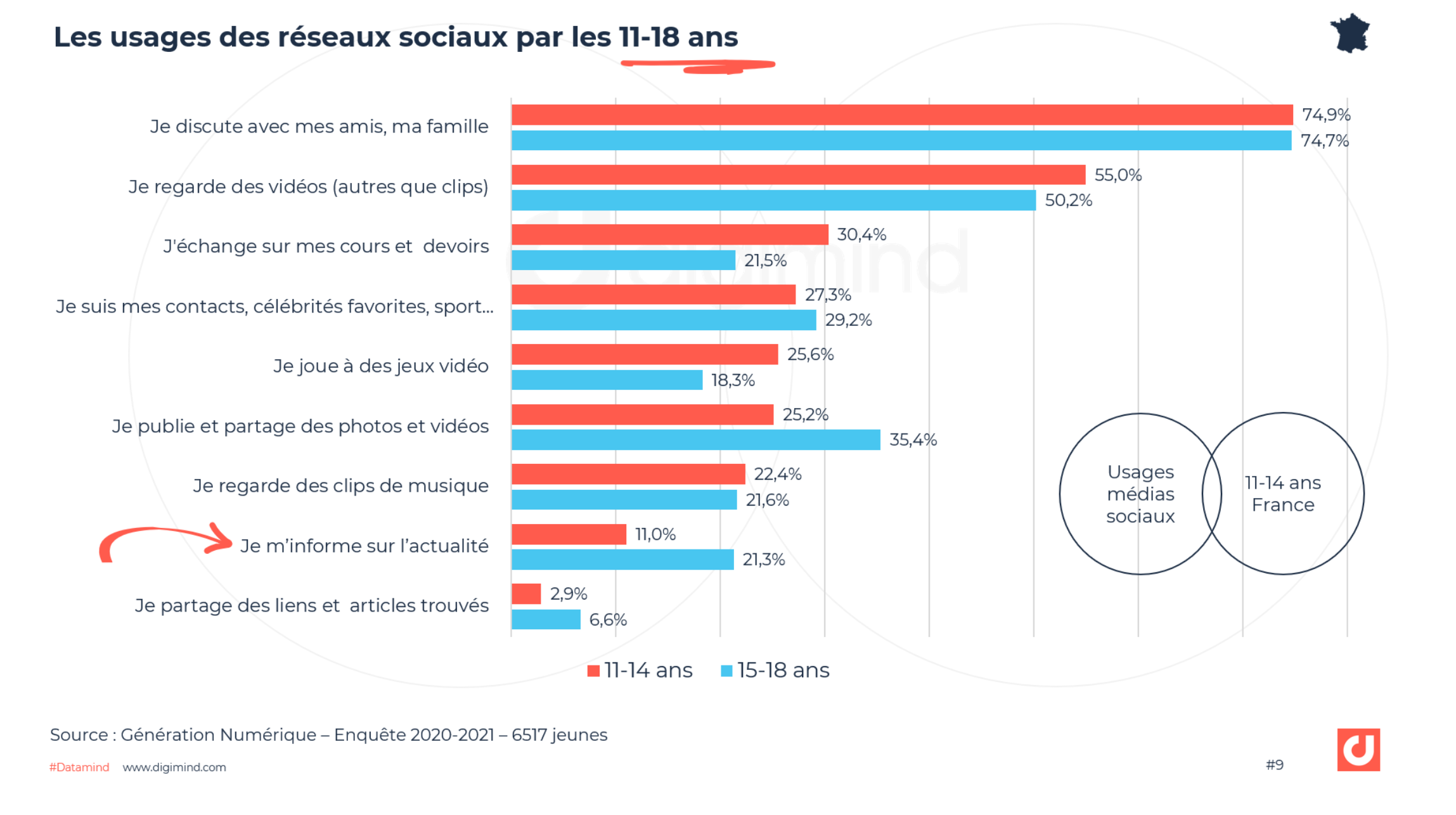 Chez les 11-14 ans, utiliser les réseaux sociaux pour s'informer n’est pas l’usage le plus répandu puisque seuls 11% les utilisent pour accéder à l'actualité.