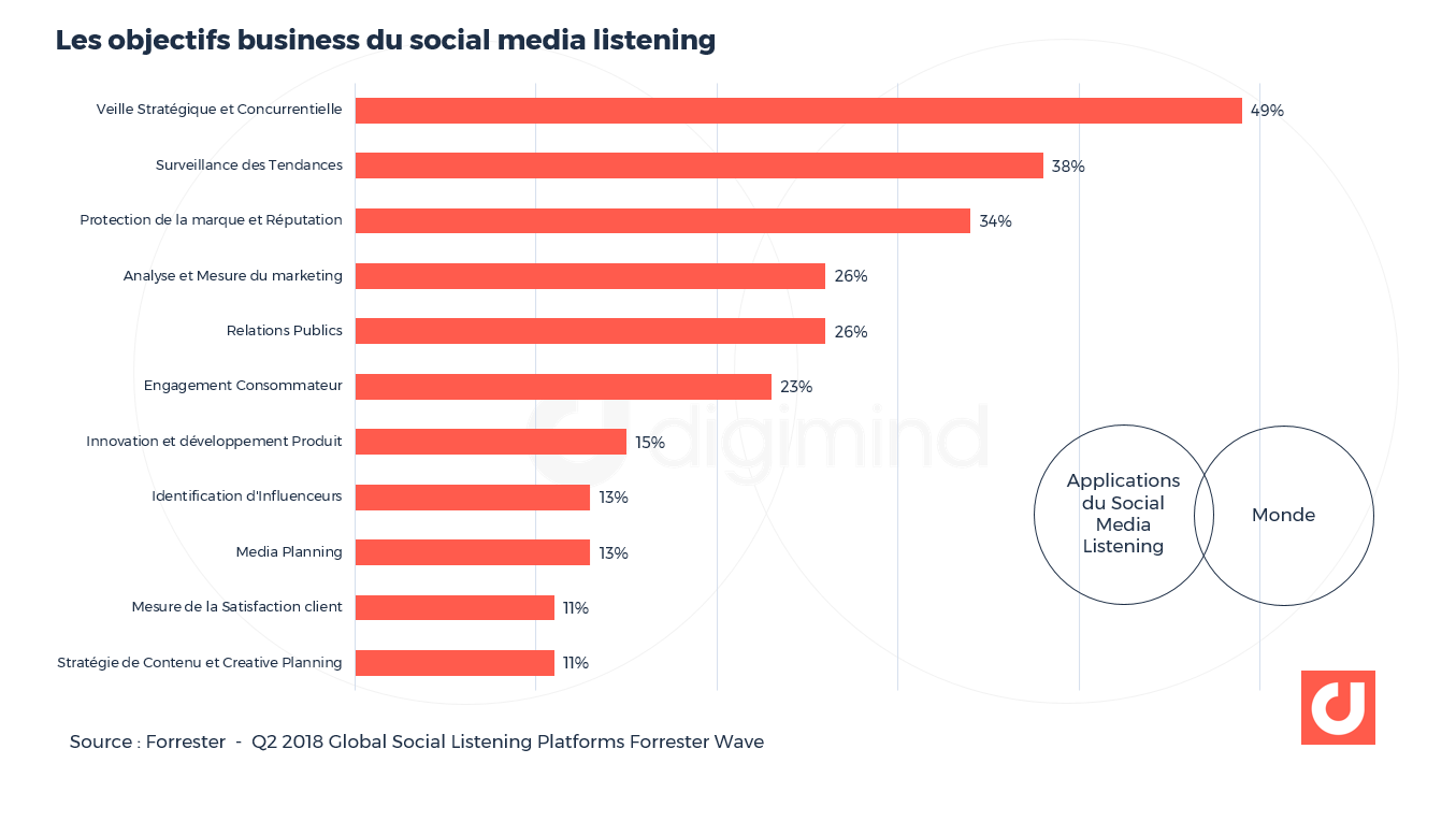 Le cabinet Forrester, de son côté, a déterminé les 11 objectifs “business” les plus fréquents pour les responsables utilisateurs d’outils de social media listening dans le monde (b). La veille stratégique et concurrentielle est le premier des usages avec 49% des réponses suivie par la surveillance des tendances (38%), la gestion de la réputation de la marque (34%) puis l’analyse et mesure du marketing (campagnes) avec 26%.
