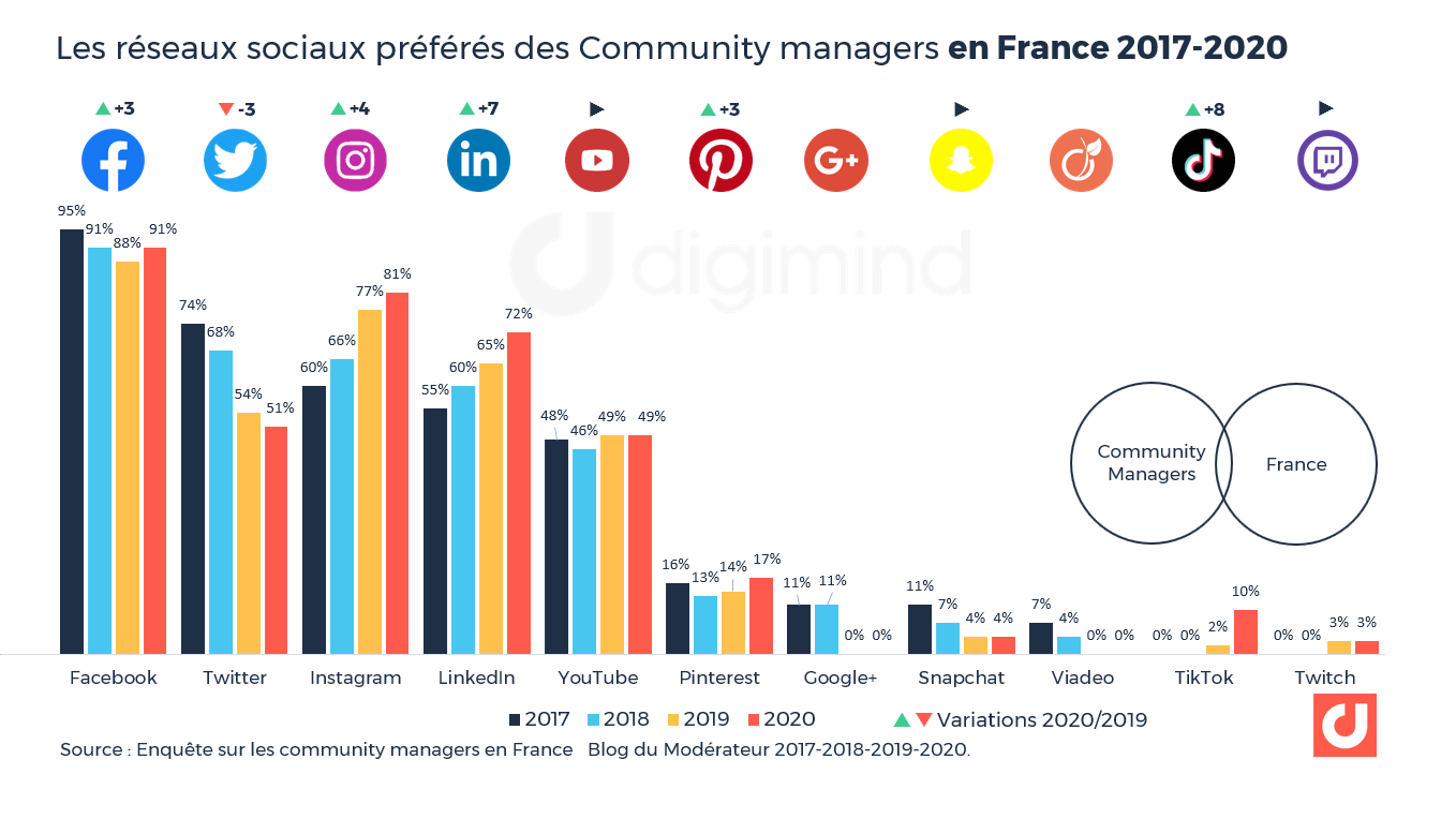 Les réseaux sociaux préférés des Community managers en France 2017-2020