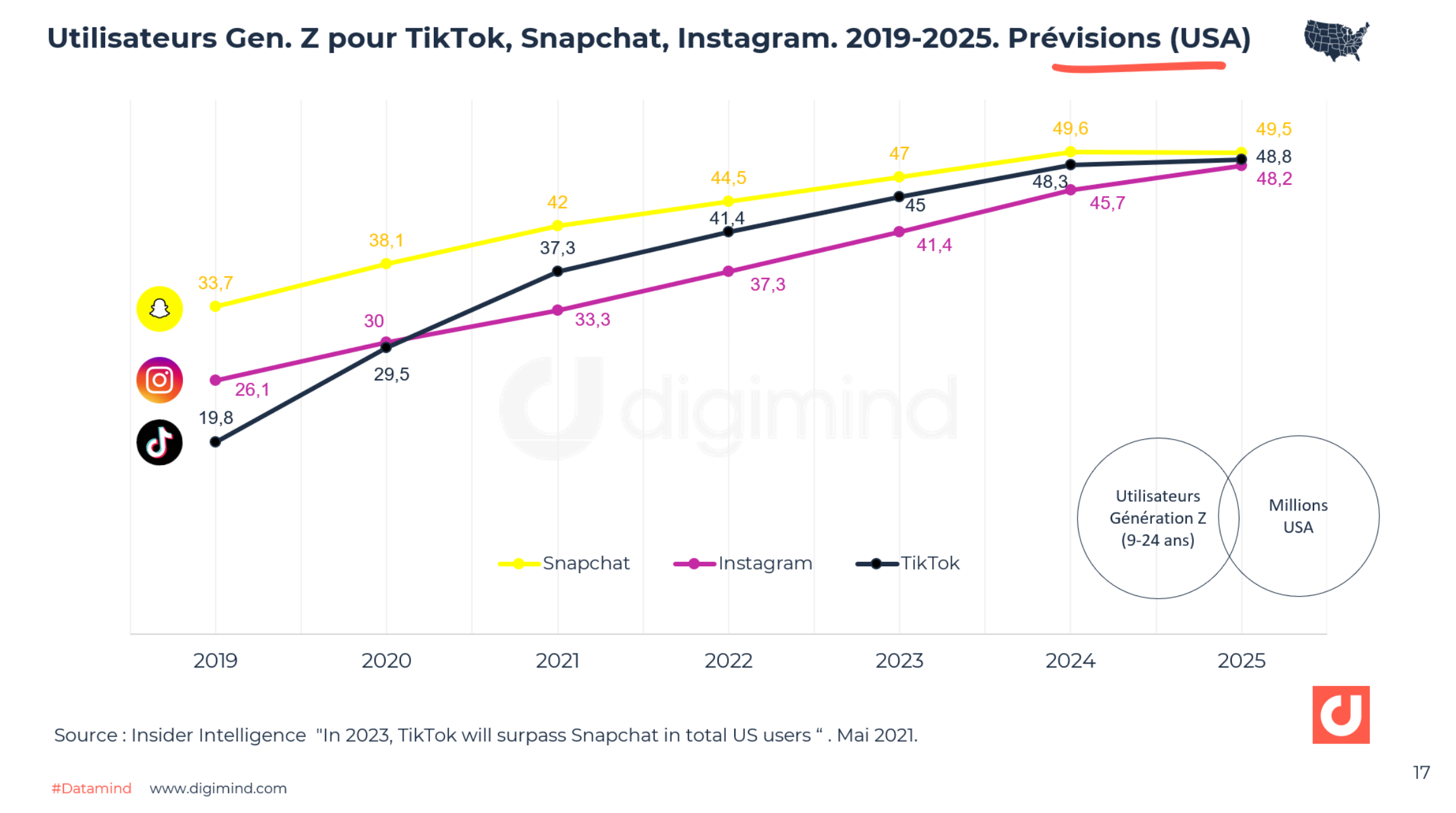 Attention néanmoins, il est nécessaire de raisonner par classe d'âge. Ainsi, pour la GenZ aux USA (la génération née après 1995), le cabinet emarketer prévoit une forte progression de TikTok dès cette année et des parts de marché très similaires à l’horizon 2025 pour Snapchat, Instagram, TikTok. De quoi faire évoluer encore fortement les pratiques des marketeurs. A suivre….