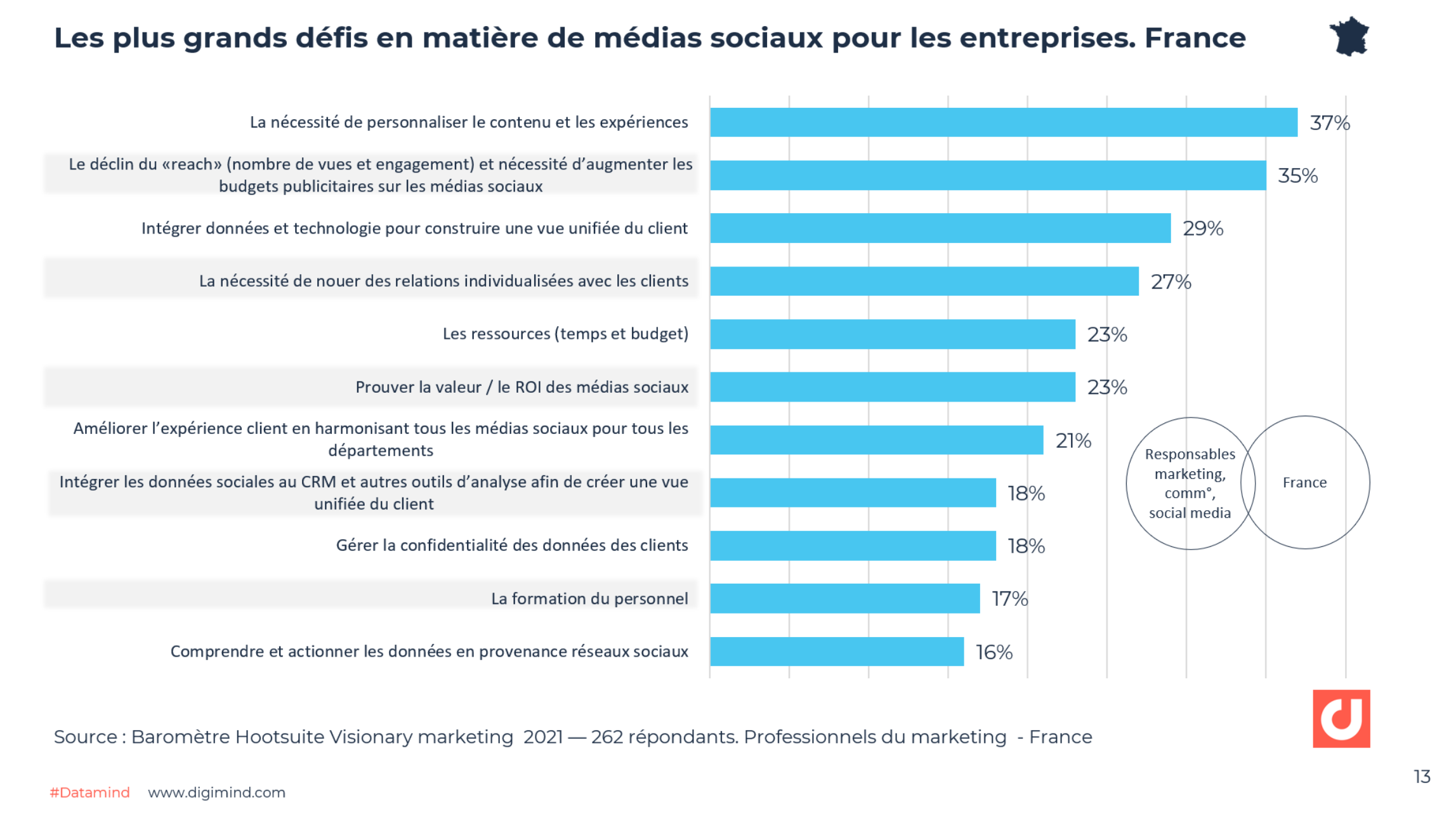 Ainsi les professionnels français sont conscients de la nécessité de personnaliser leurs contenus et les expériences (37%) et de la problématique de déclin du reach, qui conduit à devoir augmenter les budgets publicitaires (35%).