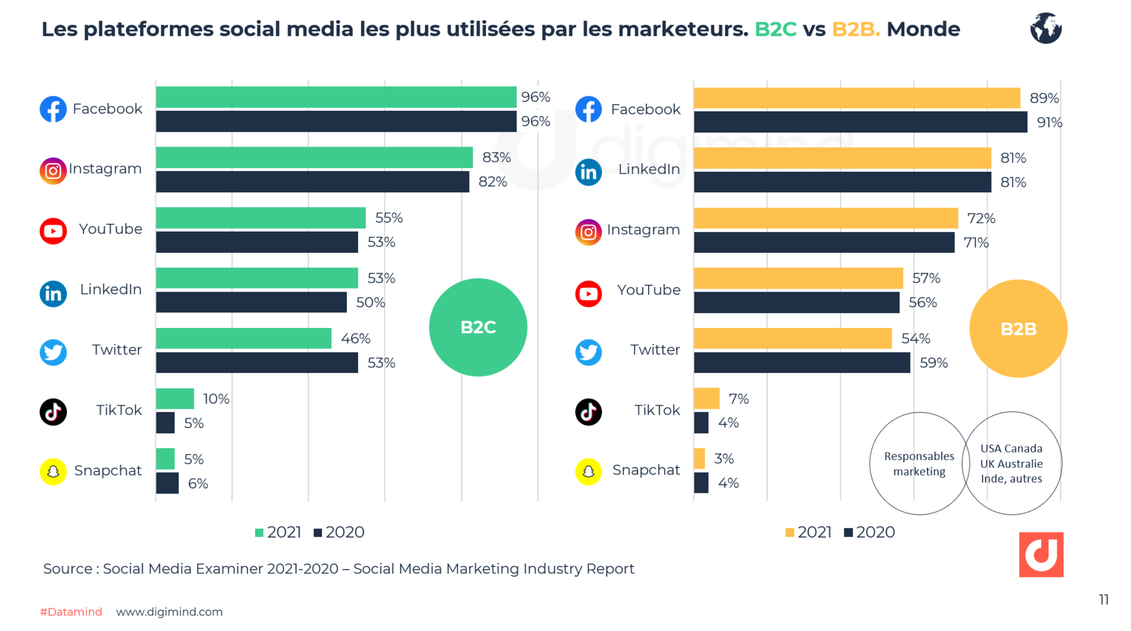 Dans les autres pays du monde (USA, Canada, Royaume-Uni, Australie, Inde,..) Facebook règne aussi en maître chez les marketeurs même pour les activités B2B où il devance LinkedIn. Si TikTok progresse en B2B comme en B2B, Snapchat semble davantage stagner dans les usages. Enfin, Twitter paraît opérer un recul inquiétant dans une proportion unique. Une tendance d’ailleurs déjà observée en 2019-2020.