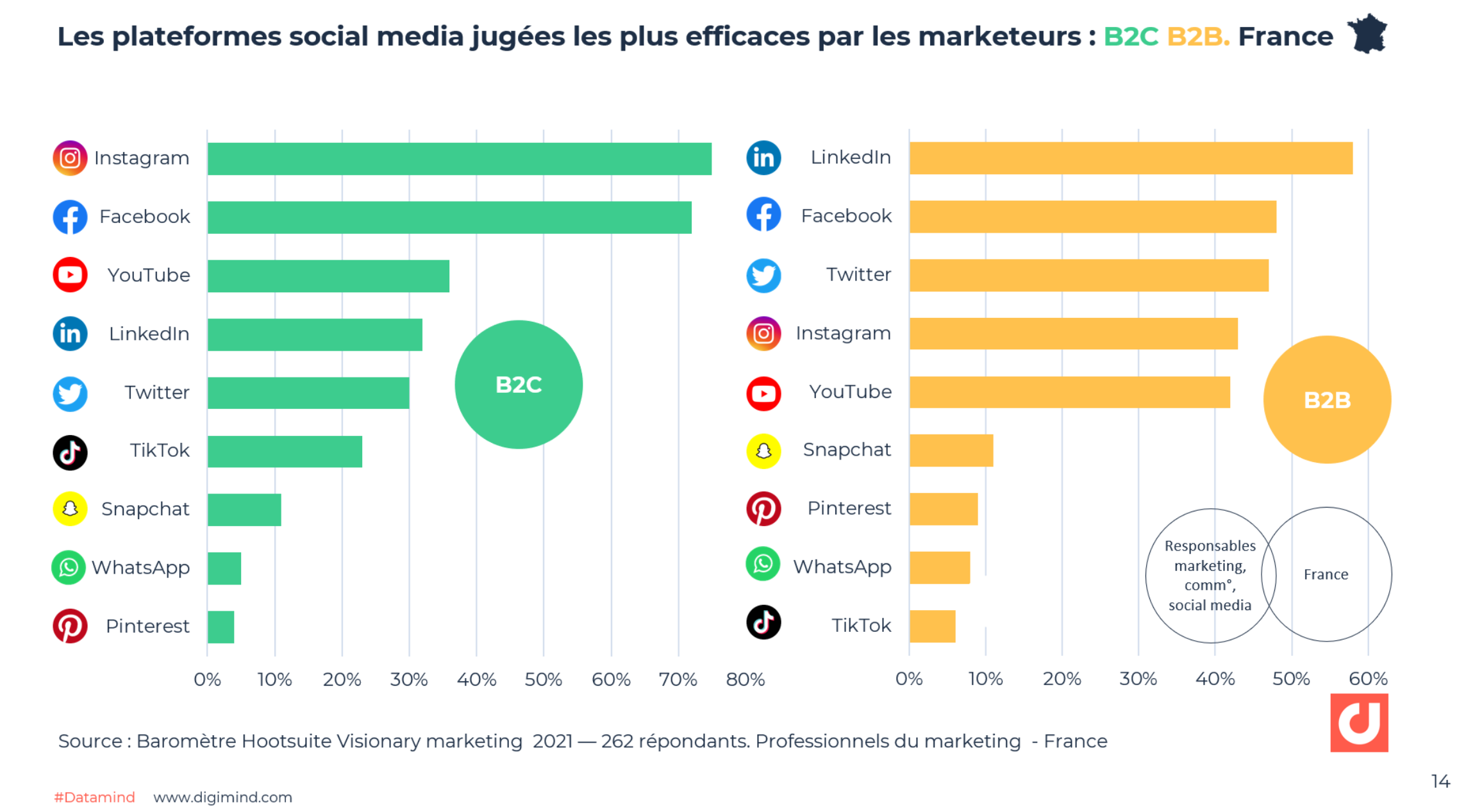 Les plateformes social media jugées les plus efficaces par les marketeurs en France : B2C B2B