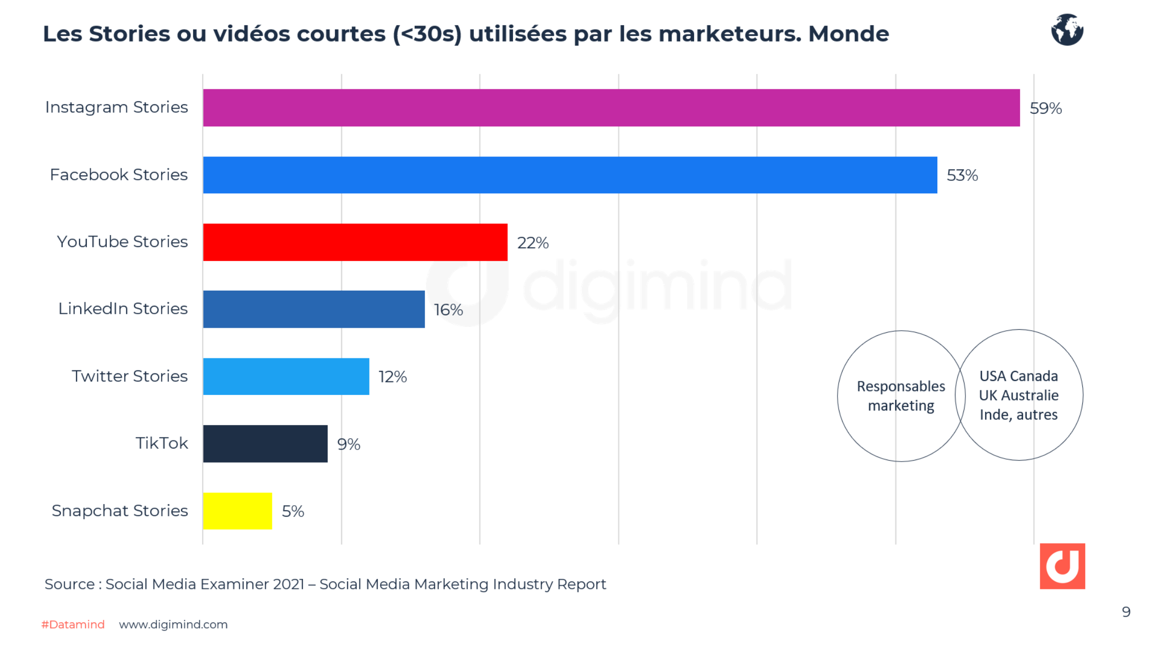 Les Stories ou vidéos courtes (<30s) utilisées par les marketeurs. Monde
