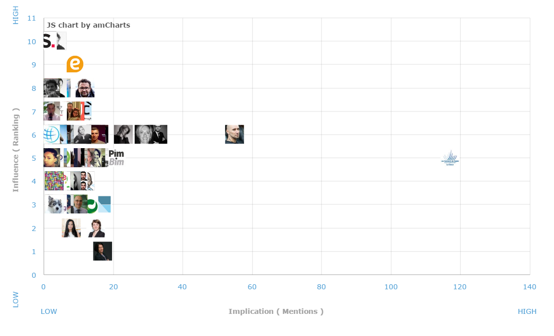 En termes de forte implication sur l'événement, ce sont les comptes des Sommets du Digital, de Arnaud Le Roux et Jérôme Monange qui se distinguent. En termes de comptes à très forte audience, Stratégies (@Strategies), David Abiker (@DavidAbiker), eMarketing, Cyril Attias, Christophe Ramel (@Kriisiis) et Marie-Laure Biscaye Vie (@marilor) se détachent.