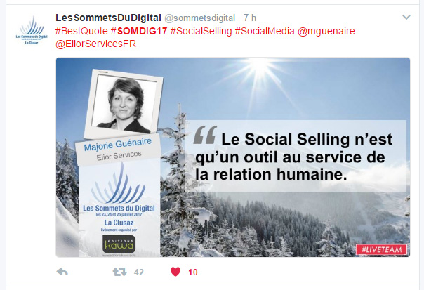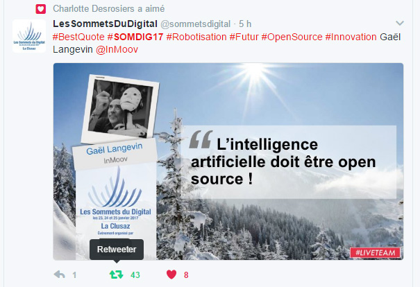 Les "quotes" ont la côte. Oui, c'était facile 😏. Ce sont en effet les tweets du compte officiel des Sommets du Digital (@sommetsdigital) sur les "top citations" des intervenants qui ont suscité le plus d'engagement. Ce sont les citations de Gaël Langevin (@InMoov) et Marjorie Guénaire (@mguenaire) de @EliorServicesFR qui remportent la palme.