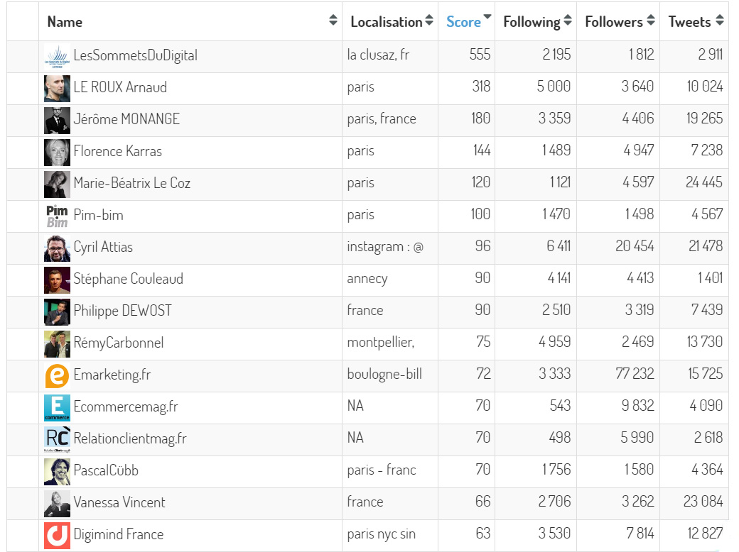 Le compte des organisateurs @Sommetsdigital occupe logiquement la 1ère place. En 2ème position se situe Arnaud Leroux (@ArnaudLeRoux) CDO de HomeServe France, suivi de Jérôme Monange (@JeromeMONANGE) Top influencer LVMH, Florence Karras (@Flokarras) Chief Digital Officer et Marie-Béatrix Le Coz (@mbxl) Social Media Manager, toutes deux à BNP Paribas Cardif France. A la 6ème position se place la société Pim Bim (@Pimbim_) suivi de Cyril Attias (@cyril), Stéphane Couleaud (@scouleaud) et Philippe Dewost (@pdewost ). A noter la forte participation de Editialis à travers ses publications Emarketing.fr (@Emarketing_fr), Ecommercemag.fr (@Ecommercemag_fr ) et RelationClientmag.fr (@Relationcltmag ).