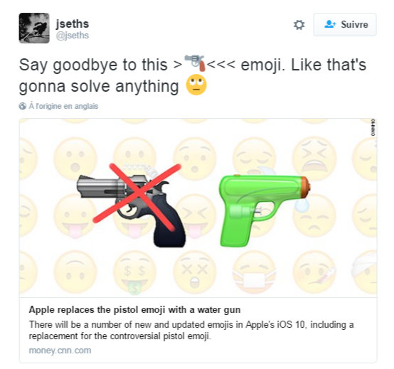 Apple tend à imposer son modèle d'émoticônes à travers les choix de ses icônes pour ses iPhone. L'année passée, Facebook puis Twitter ont fortement développé l’usage des émoticônes dans leurs interfaces mobiles comme desktop. Apple a dévoilé 100 nouveaux émoticônes pour les iPhone et iPad pour le lancement d'iOS 10 à l'automne dernier. Loin d’être gadget ou anecdotique, l’émoticône, massivement utilisé, est un véritable sujet de discussions passionnées, tant les choix de couleurs de peau, d’armes, de costumes révèlent l’évolution de la société, la prépondérance d’un pays, d’une coutume, d’un mode de vie.