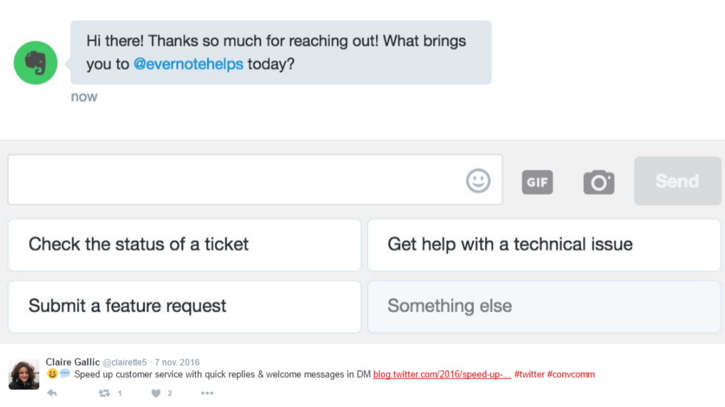Dans ce contexte, les grandes plateformes sociales intègrent des outils de relation client de plus en plus sophistiqués. Ainsi, après le Customer feedback en février, Twitter a emboîté le pas à Facebook Messenger en novembre en annonçant 2 nouveautés pour ses DM (Direct Messages) : les messages de bienvenue automatisés, et les réponses rapides automatisées grâce au Chatbots.