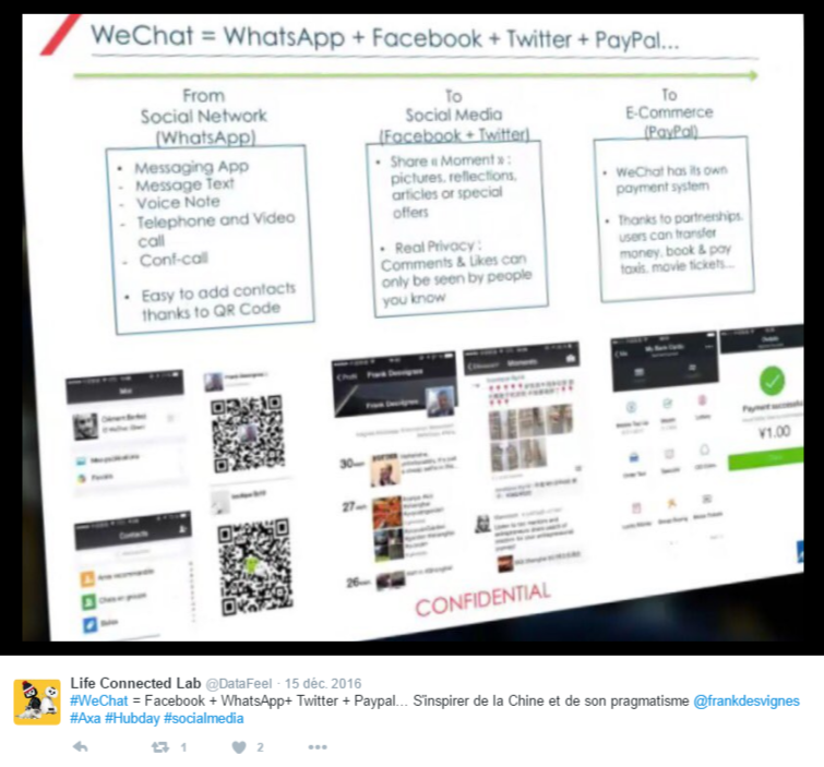 Facebook a bien compris que l’expansion future de Wechat hors Asie était dangereuse et doit intégrer de nombreux services pour le concurrencer. Or WeChat, c’est une plateforme globale qui inclue Chat, réseau social, fils d'actualités, paiement en ligne. C’est un mix de Facebook, Twitter, WhatsApp, Instagram et Paypal. Bref une plateforme multifonction. Qui s’invite aussi sur le marché des objets connectés ou la reconnaissance d’images et de sons.