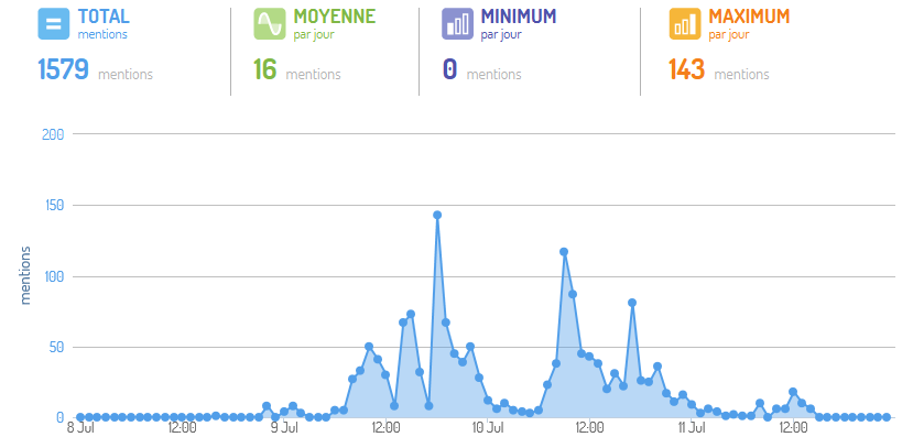 Un "pic" (tout est relatif) est atteint le 9 juillet en soirée quand le compte Twitter de la journaliste @maudvallereau publie et relaie sa news sur Metronews.