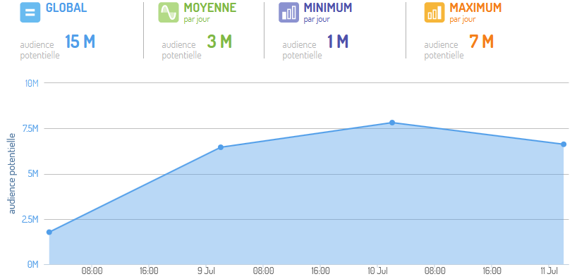 Avant l'article de Rue89, les mentions se limitent à des tweets et ne représentent une audience potentielle (un lectorat) "que" de 50000 internautes. Le 9 juillet, à 16H00, après l'article dans Rue89 et plusieurs reprises dans la presse web, l'audience potentielle est déjà de 7 millions d'internautes pour atteindre 15 millions au global sur la période.