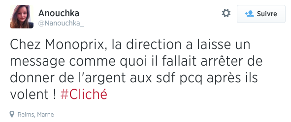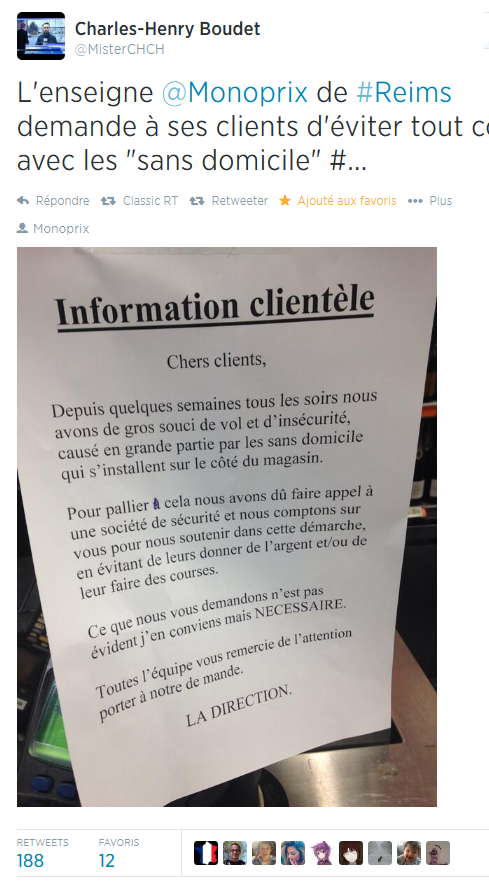Le 8 juillet après-midi, une internaute de Reims tweete "Chez Monoprix, la direction a laisse un message comme quoi il fallait arrêter de donner de l'argent aux sdf pcq après ils volent !"