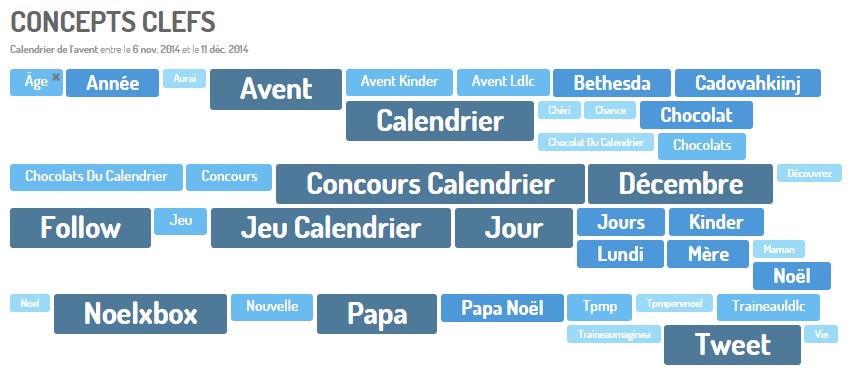 Du 6 novembre au 15 décembre, on ne dénombre pas moins de 143 013 mentions concernant le célèbre calendrier de fin d’année ! Trois axes de concepts-clés se dessinent. Le premier rappelle qu’il n’y a pas d’âge pour avoir un calendrier de l’avent, et que c’est souvent Maman qui l’achète. Le second reprend les mots clés associés aux thématiques classiques de la période : « Noël », « Papa Noël », « Calendrier »… Enfin, cette tradition du compte-à-rebours avant Noël est l’occasion de nombreux jeux concours se déroulant notamment sur Twitter et se rapportant souvent aux jeux vidéo, d’où les concepts « Tweet », «Noelxbox », « Concours calendrier », « Follow » …