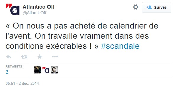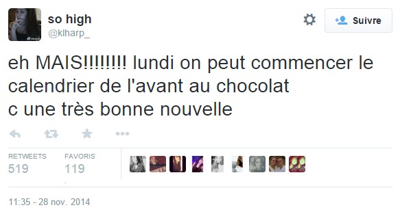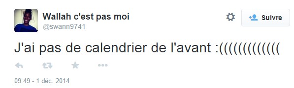 Le calendrier de l’avent est un véritable sujet sur le net dès le 7 novembre, avec 427 mentions ce jour-là. Jusqu’au 29 novembre, l’excitation et l’impatience se font sentir et sont alimentés par la présentation des calendriers disponibles : Lego, Playmobil, L’Occitane, My Little Paris, Kinder… Paradoxal : on compte les jours avant le 1er décembre, début du calendrier de l’avent. Durant cette période précédant les fameux 24 jours, les témoignages d’internautes se multiplient informant la communauté qu’ils sont équipés pour cet évènement. Ils s’interrogent les uns les autres pour savoir qui en a, comment il est, etc. Le 30 novembre, le web est en effervescence et se couche plein de ferveur. Le 1er décembre le bonheur est à son comble, les internautes se réjouissent de l’ouverture de la première fenêtre, et de la découverte des nombreuses surprises. Très vite, l’effervescence retombe, et dès la première semaine les internautes délaissent ce qu’ils ont tant attendu.