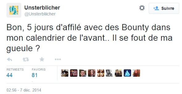 Le calendrier de l’avent Célébrations connaît quelques critiques des internautes qui ne semblent pas apprécier les Bounty. Le calendrier déguste sur le web après 5 fenêtres de suite ouvrant sur un Bounty.