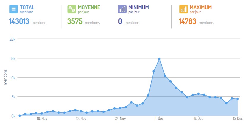 Le nombre de mentions plutôt régulier à partir de la seconde semaine de décembre s’explique par les publications quotidiennes au rythme du calendrier de l’avent. Et oui ! Ceux qui se sont engagés dans un calendrier de l’avent, le tiennent ! Que ce soit des sites de news, des blogueurs ou encore des particuliers.