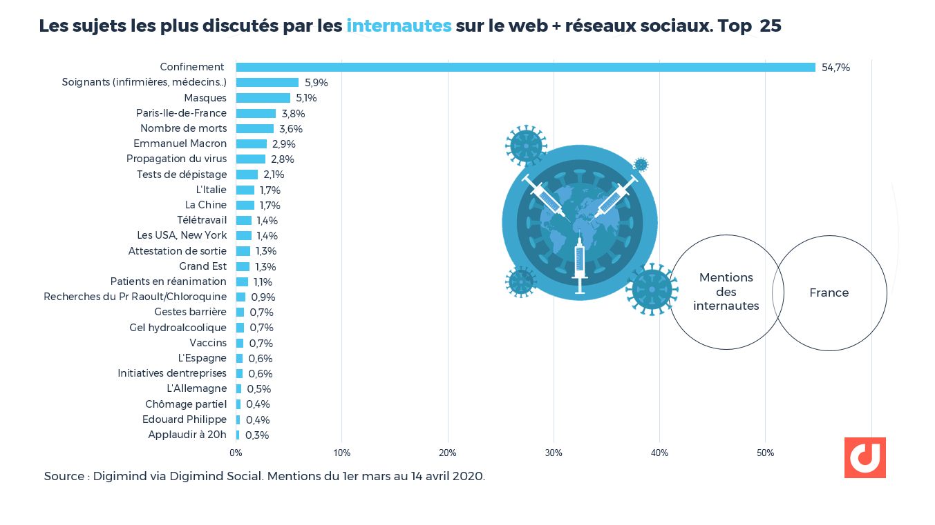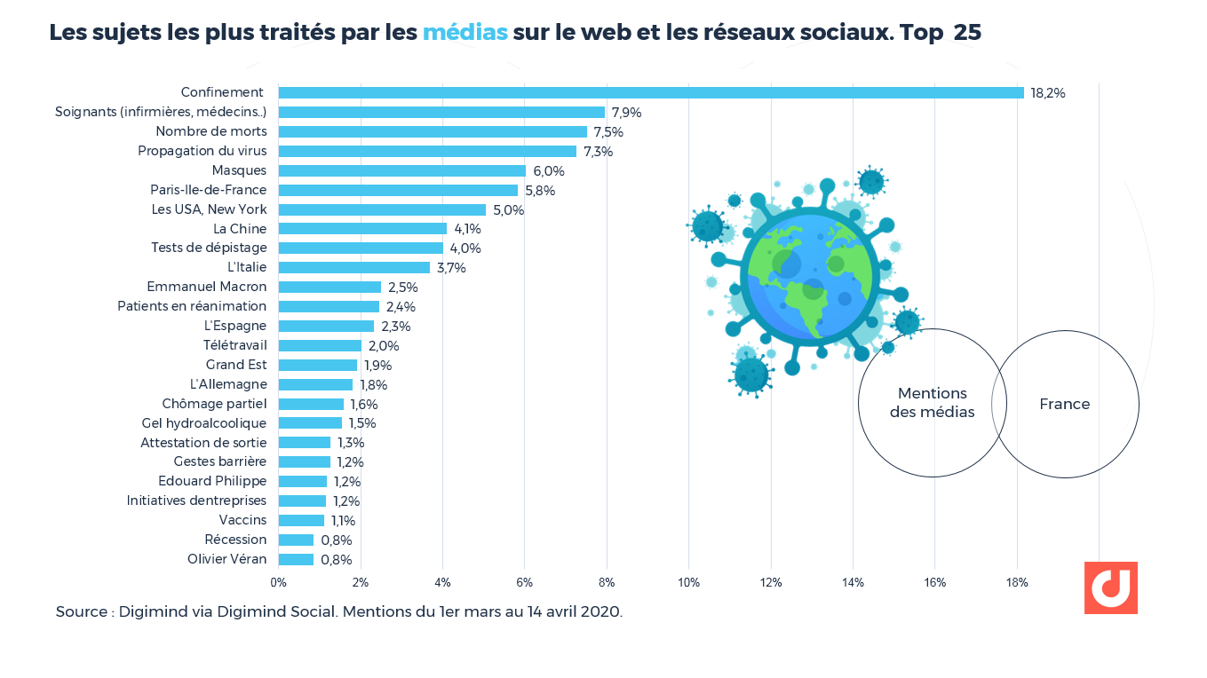 ↑ Covid-19 : les sujets les plus traités par les médias sur le web et les réseaux sociaux. Top 25