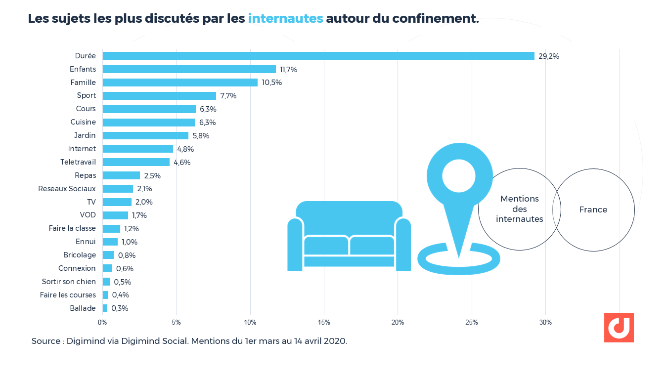 C’est logique : les français communiquent d’abord sur ce qu’ils vivent au quotidien en tant que confinés. Le thème du confinement est vaste. Ainsi, lorsqu’ils en discutent, ils évoquent les sujets liés à sa durée, aux enfants, à la famille, au sport, au cours, à la cuisine et au jardin. En effet, presque toutes les activités, contraintes et occupations sont abordées sous forme de témoignages, questions ou messages humoristiques.