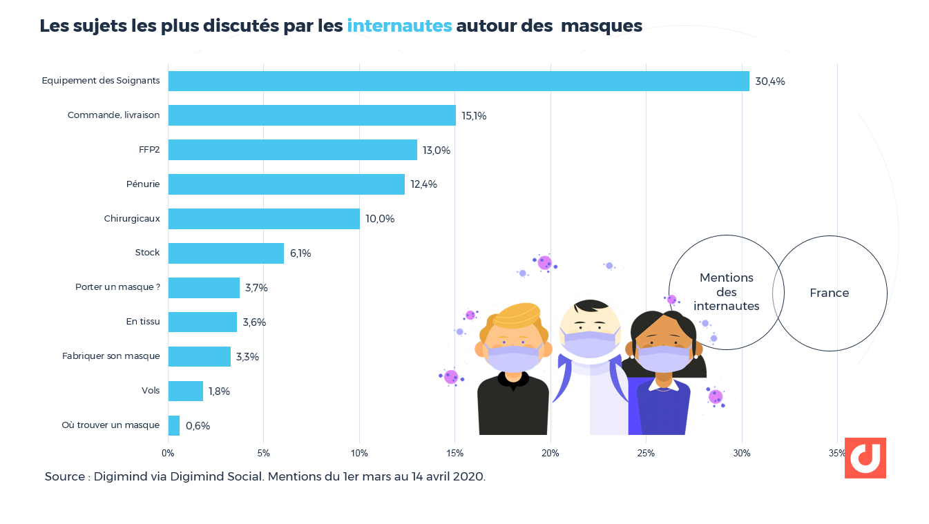 Le 3ème sujet abordé (5% des mentions) concerne les masques : Les internautes partagent notamment un agacement envers la gestion gouvernementale, des critiques des risques encourus par les soignants ou encore des astuces pour fabriquer un masque en tissu.