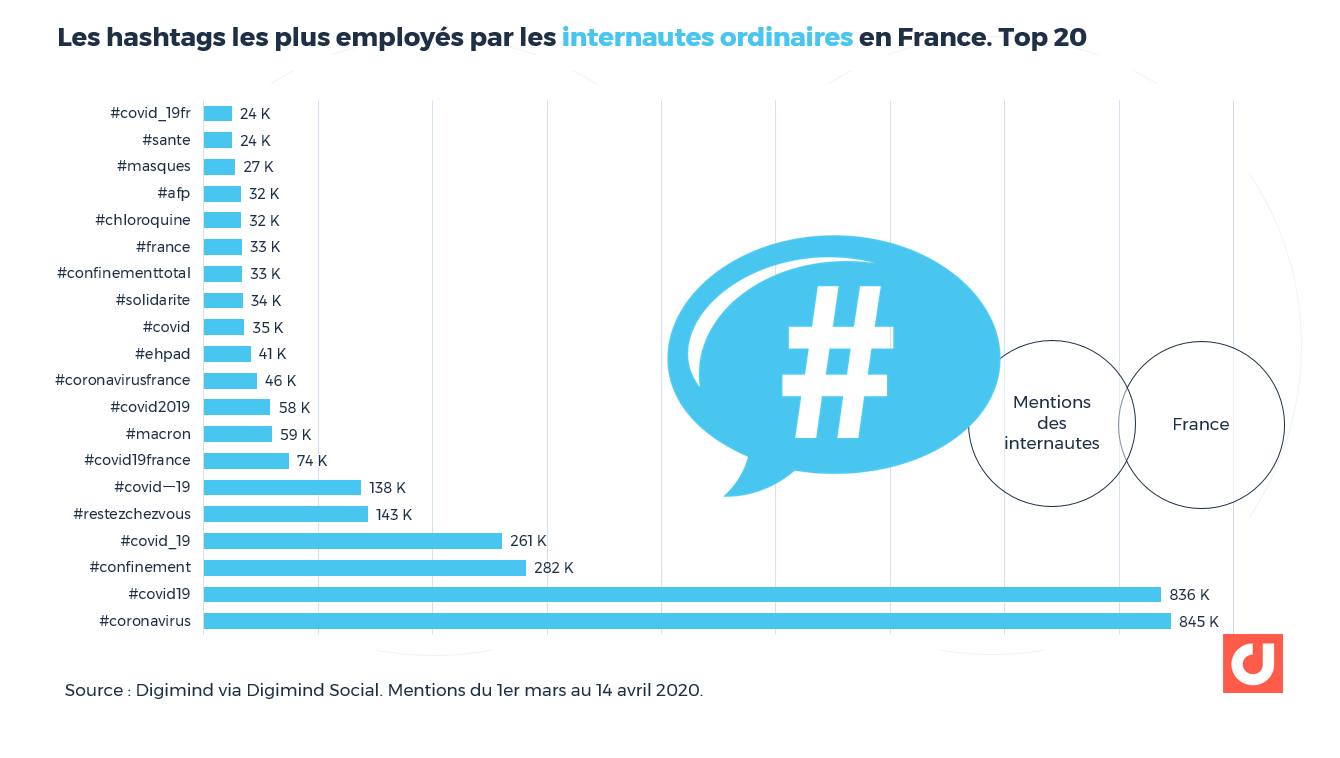 Les hashtags connexes aux #coronavirus et #covid19 sont #covid_19, #covid--19, #covid19france, #covid2019 et #coronavirusFrance. A noter la présence de forts volumes autour de #ephad, #chloroquine et #masques. Par ailleurs, chaque jour apparait le hashtag #ConfinementJour(X).