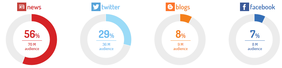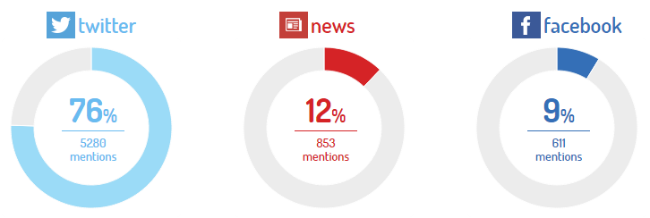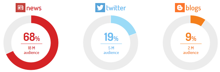 En termes de mentions, Twitter est largement en tête avec plus de 30500 tweets. Les sites de news représentent quant à eux 10% des mentions, avec 374 articles. Toutefois, en ce qui concerne l’audience, les sites d’actualité repassent devant avec 70 millions de vues potentielles grâce aux articles publiés par les grands sites de presse online, tels que Le Monde, Le Figaro etc.