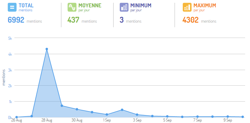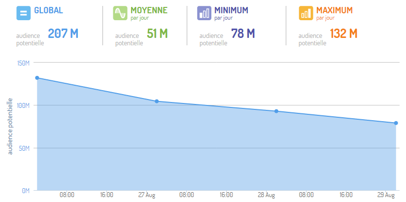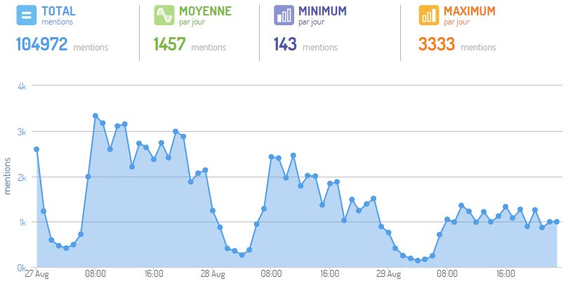 Pour ce qui est de l’évolution des mentions, on observe bien un pic démarrant à 8h, avec un nombre maximum à 3 333 mentions, suivi d’une baisse tout au long de la journée et une moyenne de 1 457 mentions journalières. En volume, le nombre de mentions tend à décroître dès le premier jour et ce, jusqu’au troisième et dernier jour étudié. Le même schéma se confirme pour ce qui est de l’audience avec une valeur haute à 132 millions dès le lendemain et une valeur basse à 78 millions le troisième jour.