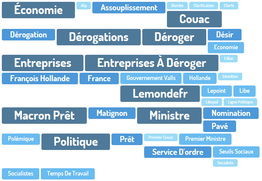 Les concepts clefs liés aux 35 heures peuvent être regroupés en 3 catégories. La première regroupe les termes relatifs à la déclaration « couac », « bombe », « clarification », « désir » ou encore « pavé » marquant ainsi très bien l’ampleur d’un tel sujet. La seconde catégorie porte sur l’aspect technique d’une telle question « déroger », « dérogation », « entreprises à déroger », « économie » et « seuils sociaux ». Enfin la dernière catégorie se concentre sur le paysage politique et ses appartenances avec « socialistes », « marcon prêt », « françois hollande », « gouvernement valls » et « matignon ».