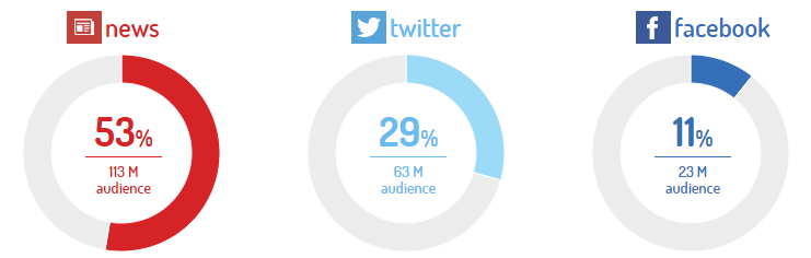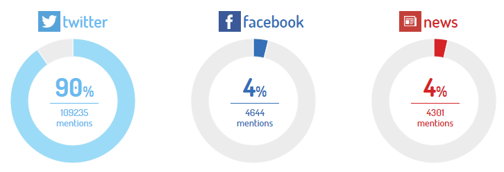 Des trois principaux canaux de communication utilisés, c’est Twitter qui arrive largement en tête avec 109 235 mentions soit près de 90% du total contre seulement 4% pour Facebook et les News: cela s’explique par le rôle majeur qu’occupe Twitter comme canal de communication où un très grand nombre de personnes se font le relais de l’information et n’hésitent pas à la commenter. Toutefois la répartition est différente pour l’audience avec une part de 53% pour les News, qui ne comptabilisaient que 4 % du total des mentions. Ceci s’explique par le grand rayonnement et la forte visibilité des sites News avec des acteurs comme Le Monde, Le Figaro, Libération qui génèrent plusieurs millions de visites.