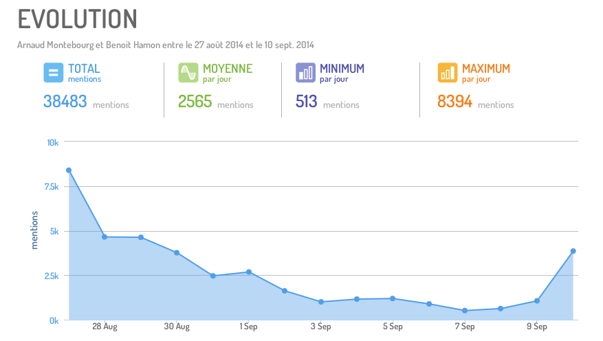 Suite à l’annonce du nouveau gouvernement Valls, les évolutions du nombre de mentions liées à Arnaud Montebourg et à Benoît Hamon suivent la même tendance.