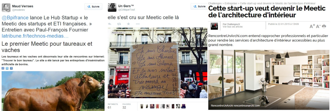 En octobre 2014, les éleveurs de bovins se réjouissent du lancement du site « trouverlebontaureau.com » qui recense de nombreux profils de vaches et de taureaux dans l’optique d’agrandir les troupeaux. Les internautes et les sites de presse s’empressent d’y voir le « Meetic pour les vaches » (370 mentions). On comprend alors que Meetic apparaît comme la référence des sites de rencontres, au point de désigner leur ensemble. Plus largement, « le Meetic » est devenu une expression commune synonyme d’ « entremetteur » ou tout simplement d’ « intermédiaire ».