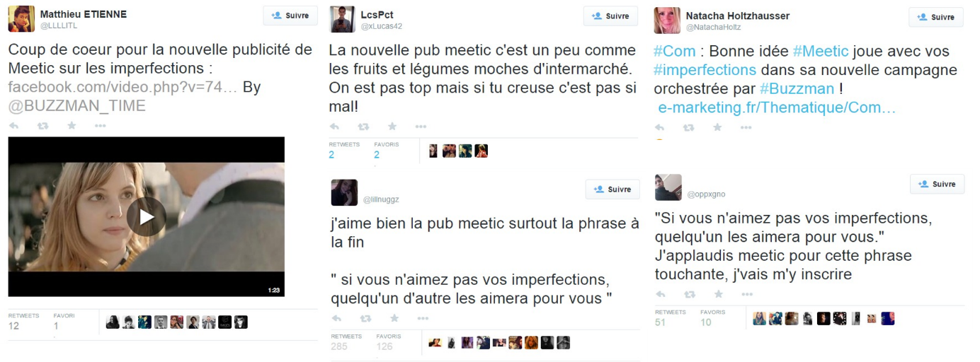 On comptabilise plus de 1100 publications à ce sujet, soit seulement 10% de l’ensemble des mentions étudiées. En effet, Meetic est victime de son succès : beaucoup de verbatim sont liés au fait que le nom du site soit à présent une antonomase. On ne dénombre qu’un article de presse consacré à cette nouvelle campagne, sur CB News, et 2 articles de blog s’intéressant à la musique du spot (« See you all » signée Koudlam). La quasi-totalité des mentions proviennent de Twitter (95%) et dans une moindre mesure de Facebook (4%). Les internautes se plaisent à partager la vidéo et la phrase associée « Si vous n'aimez pas vos imperfections quelqu'un les aimera pour vous ». Cette nouvelle campagne du professionnel de l’amour est bien accueillie dans la grande famille du web puisque 96% des publications la saluent. A noter que 7 mentions rapprochent cette campagne « Love your Imperfections » de celle d’Intermarché « Les Fruits et Légumes Moches ».