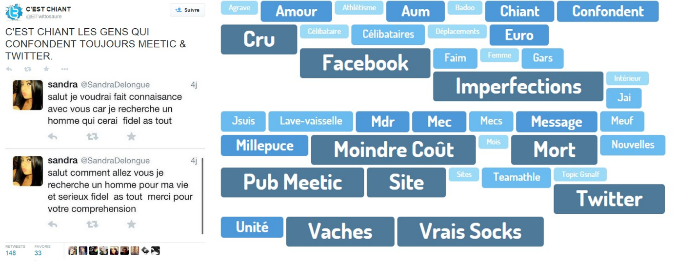 On peut s’étonner de ne trouver que le seul concept clé « Amour » comme terme positif se rapportant aux relations homme-femme, … à travers seulement 210 mentions qui cite le mot « Amour » au sujet de Meetic ! Toutefois, les mots moins glamour tels que « Vaches » ou « Chiant » ne caractérisent aucun des deux sexes. Le premier est généré par le lancement du « Meetic pour les vaches ». Le second, comme « Confondent », provient des tweetos agacés par les internautes utilisant Twitter dans le but de trouver l’amour ou du moins de draguer. D’ailleurs, le concept clé « cru » apparaît grâce à la conjugaison de se croire sur Meetic, très répandue sur le web : « il s’est cru sur Meetic », « il a cru que Twitter c’était Meetic » …