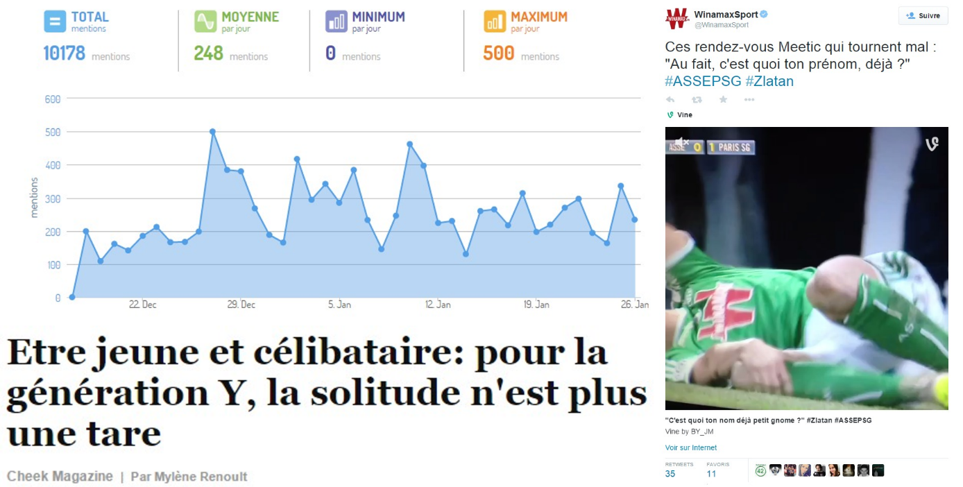 Les hauts et les bas du nombre de mentions ne semblent pas liés aux temps forts de la campagne publicitaire (les 13, 17 et 26 décembre). Les pics des 27-29 décembre sont créés par l’attroupement des multiples publications dédiées au site trouverlebontaureau.com. Le 2 janvier, les internautes s’expriment particulièrement autour de la nouvelle publicité TV de Meetic : beaucoup l’apprécient. Le 6 janvier, BFM est heureux d’annoncer aux célibataires des sites de rencontres que le mois de janvier leur est plus favorable. Le 10 janvier, il n’y a pas de publication particulière justifiant le regain d’intérêt pour Meetic. Le 18 janvier, Huffington Post révèle que pour « pour la génération Y, la solitude n'est plus une tare ». Le 25 janvier, le site de Poker en ligne Winamax Sports expérimente le newsjacking en publiant « Ces rendez-vous Meetic qui tournent mal : "Au fait, c'est quoi ton prénom, déjà ?" » accompagné de la désormais célèbre scène de Zlatan regardant le nom du maillot d’un joueur de l’ASSE sournoisement.