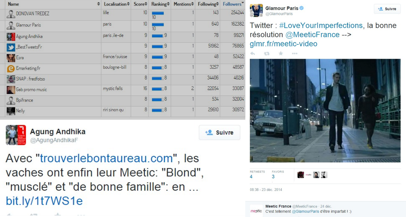 Le classement des 10 premiers influenceurs Twitter au sujet de Meetic se compose principalement d’anonymes qui diffusent les articles de presse. Nous retrouvons tout de même les comptes du magazine Glamour et du site E-Marketing.fr sous le charme du clip publicitaire. La BPI France est présente dans le top 10 par sa volonté de créer « un Meetic » destiné aux start-ups.