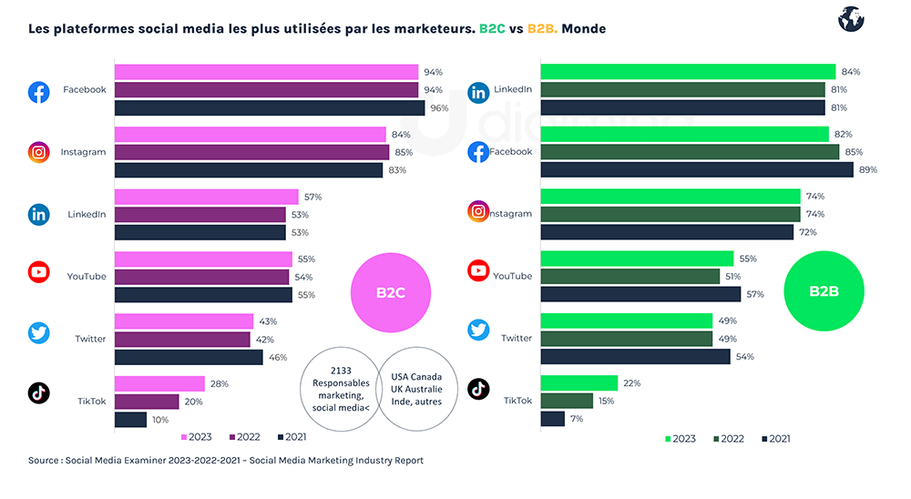 TikTok continue sa forte progression, avec une part d'utilisation qui a triplé en deux ans, passant de 10 % en 2021 à 28 % en 2023 en B2C et même de 7 à 22% pour le B2B.