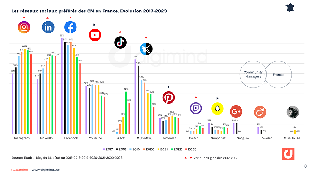 Les réseaux sociaux préférés des Community managers en France : Evolution 2017-2023