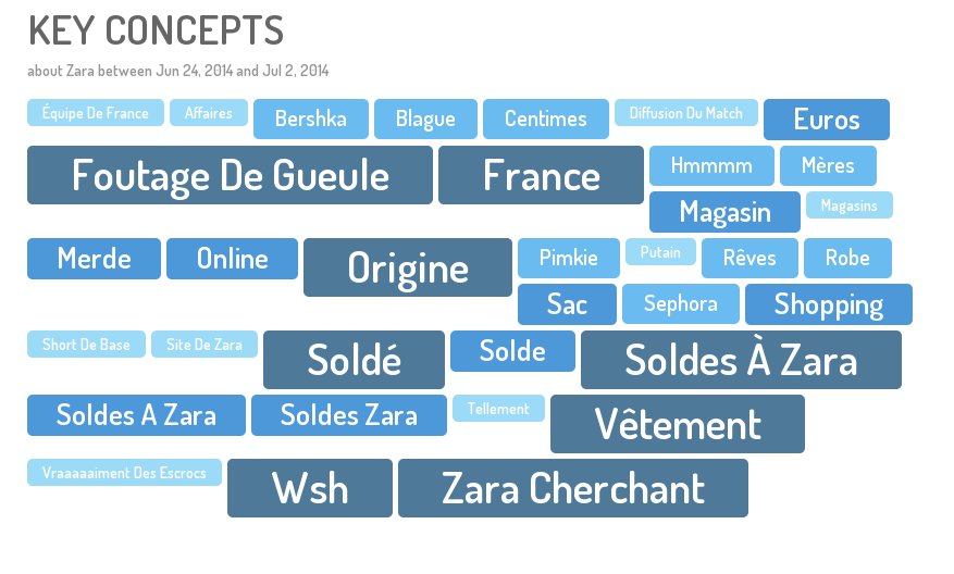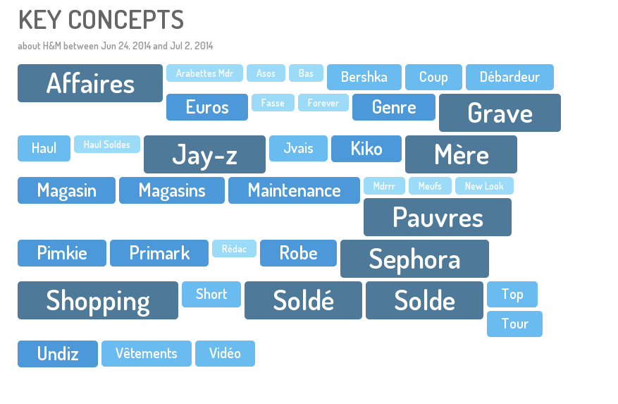 Les concepts clés H&M permettent de visualiser en un coup d'oeil ce que les internautes ont publié par rapport à la marque dans ce contexte de soldes. Ainsi, on observe une tendance assez similaires à Zara : des marques associées (Asos, Bershka, Forever 21, New Look, Pimkie, Primark, Sephora), quelques termes ironiques souvent liés à des retweets massifs, ainsi que le concept "maintenance". Ce dernier souligne le mécontentement des twittos suite à l'indisponibilité du site ecommerce de la marque, le 1er jour des soldes.