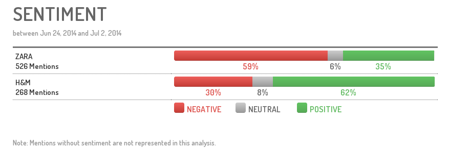 Sur l'ensemble des mentions tonalisées, on constate une forte proportion de messages négatifs (59%) concernant Zara, à l'inverse de H&M (30%).