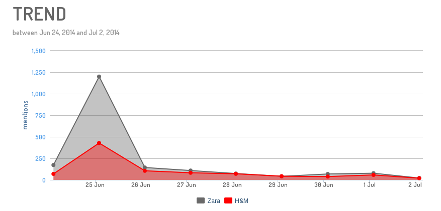 Nous avons associé aux marques H&M et Zara en France des mots clés liés spécifiques afin d'isoler des réactions spontanées liées à l'univers des soldes. 2828 mentions ont ainsi été collectées du 24 juin au 2 juillet, sur les réseaux sociaux Twitter, Facebook, Google +, Youtube, Dailymotion, Pinterest, Instagram, mais aussi sur les sites de news, les blogs, les forums.