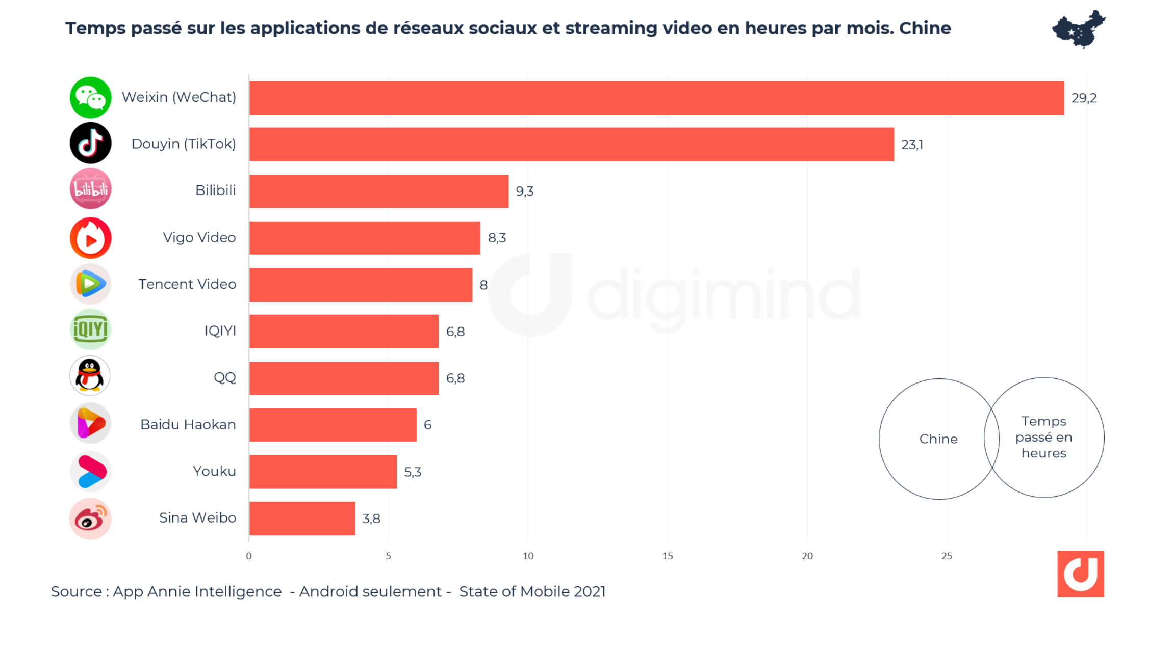 Tempo trascorso su applicazioni di social network e video streaming in ore al mese. Cina